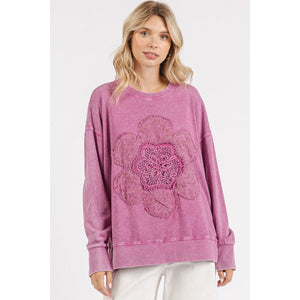 Mittoshop Flower Patch Side Slit Mineral Wash Round Neck Sweatshirt