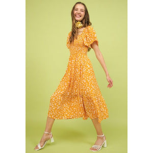 This flower print flutter sleeve smocked midi dress is a charming and feminine addition to your wardrobe. The flutter sleeves add a playful touch, while the smocked detailing provides a flattering silhouette. Stay stylish and romantic in this lovely midi dress.