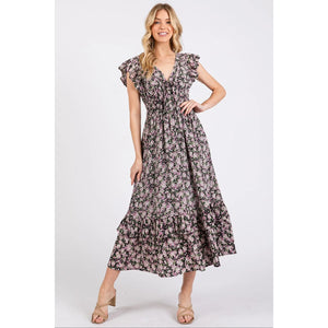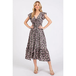 This midi dress features a charming flower print and ruffle cap sleeves for a feminine and stylish look. The V-neckline adds a touch of sophistication to the design. Made with high-quality fabric, this dress is perfect for a chic and versatile outfit. Elevate your wardrobe with this trendy flower print ruffle cap sleeve V-neck midi dress!