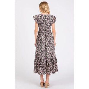 Mittoshop Flower Print Ruffle Cap Sleeve V-neck Midi Dress