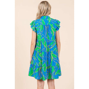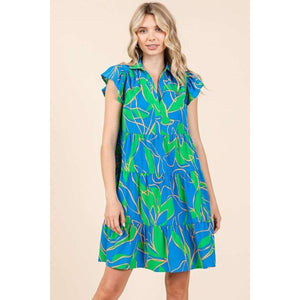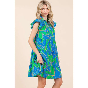 A leaf print ruffle sleeve tiered mini dress is a stylish and playful dress featuring a leaf print pattern. The ruffle sleeves add a touch of femininity and movement to the dress, while the tiered design creates a layered and textured look. The mini length falls above the knee, offering a fun and youthful vibe to the dress. The leaf print gives the dress a fresh and natural feel, perfect for spring and summer occasions. This type of dress is versatile and can be dressed up with heels for a night out or worn casually with sandals for a daytime look. It's a charming and trendy choice for a fashionable outfit.