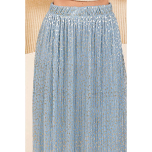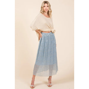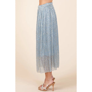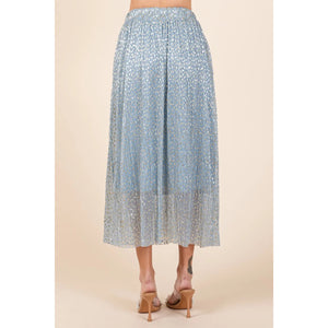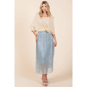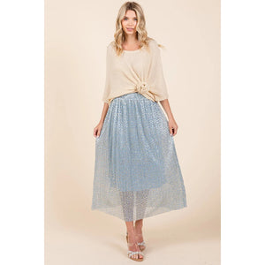 This midi skirt features a metallic glitter speckle print design for a dazzling and eye-catching look. The elastic waistband provides comfort and flexibility in fit. Perfect for adding a touch of glam to your outfit, this skirt is versatile for various occasions. Shine and sparkle in style with this metallic glitter speckle print midi skirt!