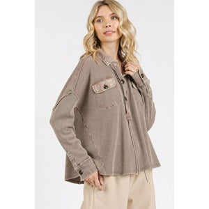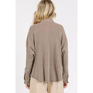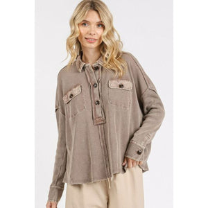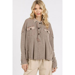 The Mineral Wash Waffle Knit Collared Neck Henley Top is a versatile and stylish addition to your wardrobe. The mineral wash finish adds a trendy touch to the classic Henley design. The waffle knit fabric provides a textured look and a cozy feel. The collared neckline adds a touch of sophistication, making this top suitable for a variety of occasions.