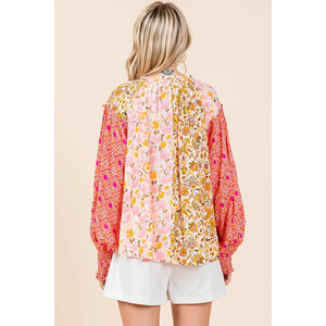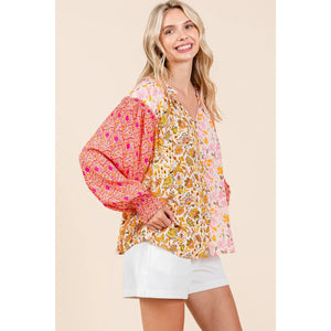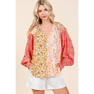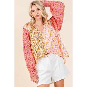 Make a statement with this mixed patchwork print long sleeve blouse. The unique combination of prints creates a bold and artistic look. The long sleeves add a touch of elegance to this blouse. Pair it with solid-colored bottoms for a fashionable and eye-catching outfit.