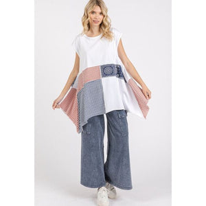 The Patchwork Mineral Washed Round Neck Cap Sleeve Top is a unique and trendy garment that combines different textures and details for a stylish look. The mineral-washed fabric gives the top a vintage and worn-in appearance, adding character to the piece. The patchwork design offers a playful and eclectic touch, creating visual interest and a dynamic aesthetic. With a round neckline and cap sleeves, this top is both comfortable and fashion-forward. Perfect for adding a fun and creative element to your outfit, this top can be paired with jeans or shorts for a casual yet trendy ensemble. Embrace a boho-inspired style with this patchwork mineral-washed top that exudes a laid-back and fashionable vibe.