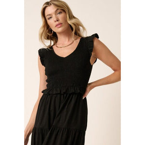 The Smocked Ruffled Tiered Midi Dress is a feminine and romantic option for any event. Its smocked bodice provides a comfortable and flattering fit. The ruffled tiered skirt adds movement and a touch of whimsy to the dress. Perfect for summer outings or special occasions, this midi dress is sure to turn heads wherever you go.