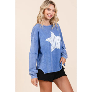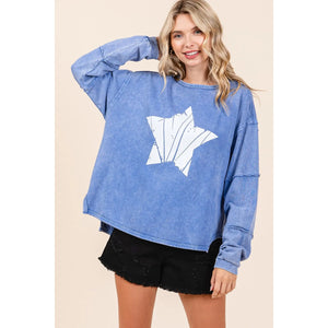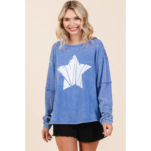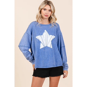 This long sleeve top features a star graphic design on a trendy mineral wash fabric for a cool and casual look. The relaxed fit and soft material make it perfect for everyday wear. Pair it with jeans or leggings for a laid-back and stylish outfit. Embrace a laid-back and effortlessly chic style with this star graphic top!