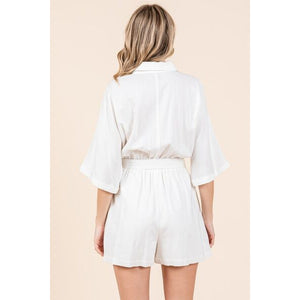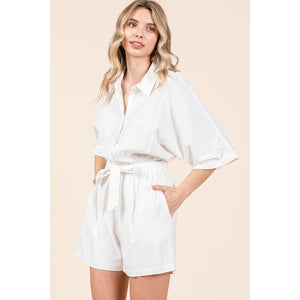 The Tie Waist Half Sleeve Romper is a stylish and versatile one-piece outfit that exudes casual elegance. With a tie waist detail and half sleeves, this romper offers a flattering and comfortable fit. The tie waist allows you to cinch in the waist for a more defined silhouette. Perfect for a day out or a casual event, this romper can be dressed up with heels or kept casual with sandals. The half sleeves provide a touch of coverage while keeping you cool and comfortable. Pair this romper with your favorite accessories for a chic and effortless look.