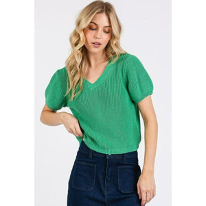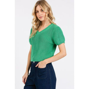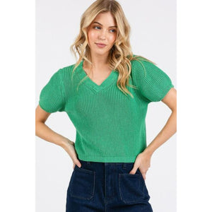 The V-Neck Short Sleeve Crop Sweater is a chic and trendy piece that combines a flattering V-neckline with short sleeves and a cropped length. This sweater is perfect for showcasing a bit of skin while still staying cozy and stylish. The V-neck adds a touch of femininity and elongates the neck, while the short sleeves make it ideal for layering or wearing on its own in warmer weather. The cropped length is fashion-forward and pairs well with high-waisted bottoms for a modern and flattering look. This sweater is a versatile wardrobe essential that can be dressed up or down for various occasions.
