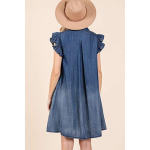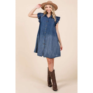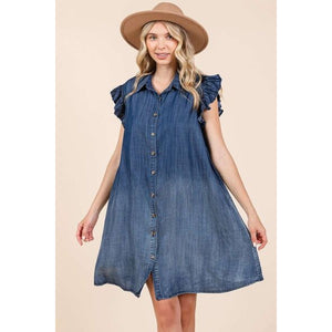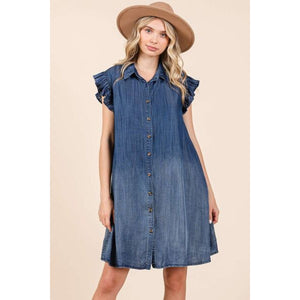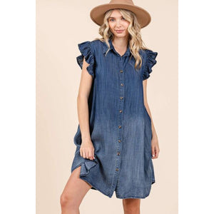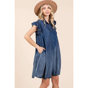 This washed chambray ruffle sleeve buttoned mini dress is effortlessly stylish and perfect for any occasion. The ruffle sleeves add a feminine touch, while the button detailing adds a trendy element to the dress. Stay comfortable and chic in this versatile piece.