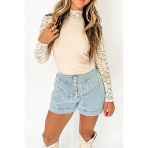 Mock Neck Long Sleeve Lace Patchwork T-Shirt