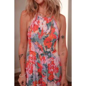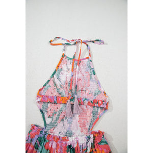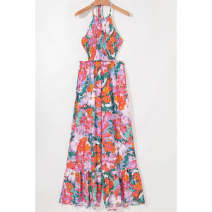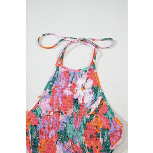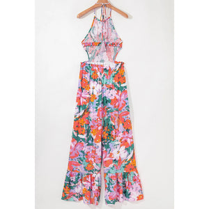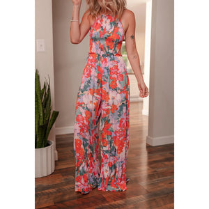 Multicolour Floral Print Smocked Halter Neck Sleeveless Wide Leg Jumpsuit