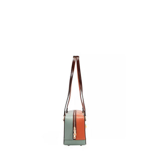 • Pebbled vegan leather exterior with glossy patent leather accents