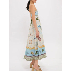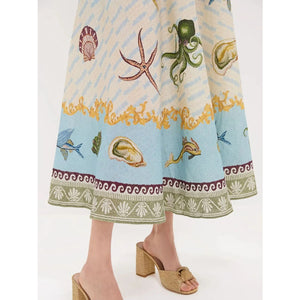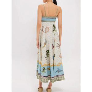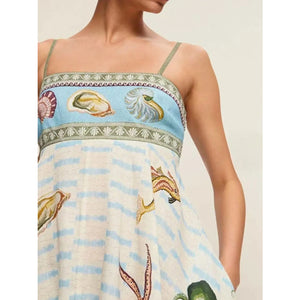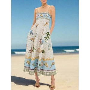 This ocean print midi dress features delicate spaghetti straps and a breezy silhouette, perfect for sunny days and beachside strolls. Its vibrant pattern brings a splash of fun to your wardrobe, while the comfortable fit keeps you feeling light and carefree all day long. Ideal for casual outings or summer parties, this dress effortlessly combines style and comfort.