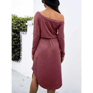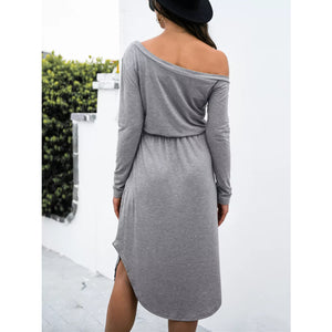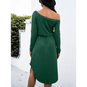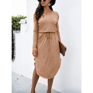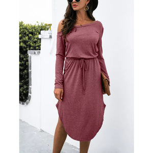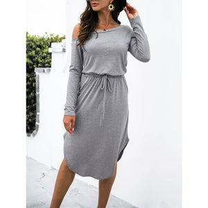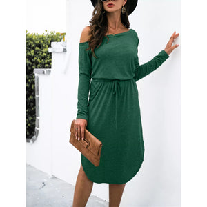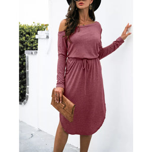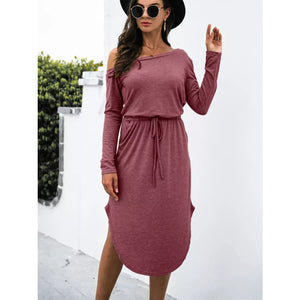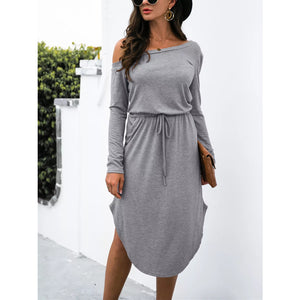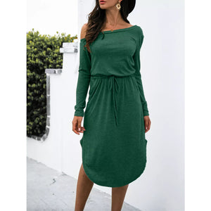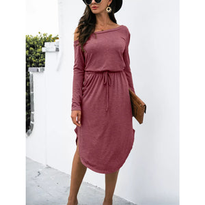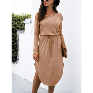 One-Shoulder Long Sleeve Midi Dress with Drawstring Waist