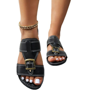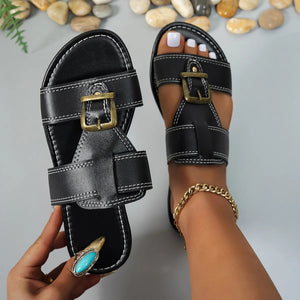 These sophisticated flat sandals combine style and comfort with their premium PU leather construction and thoughtful design elements. The double strap configuration with decorative metal buckle offers both visual appeal and adjustable fit. The cushioned footbed and non-slip sole ensure all-day comfort and stability. Crafted with contrast stitching and a rich brown colorway, these sandals are perfect for casual summer outings and everyday wear. The classic design pairs easily with both casual and semi-dressy attire.