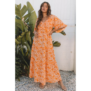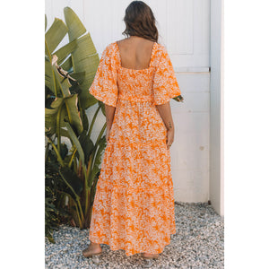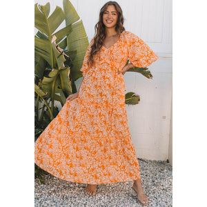 Orange Floral Print Smocked V Neck Wide Sleeve Maxi Dress