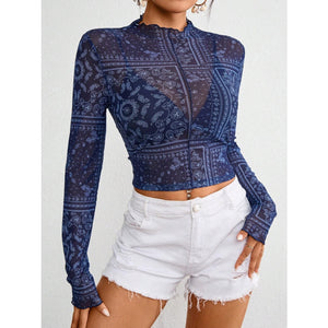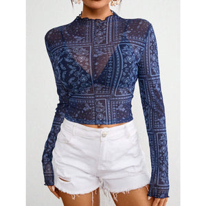 Paisley Mock Neck Long Sleeve Sheer Top