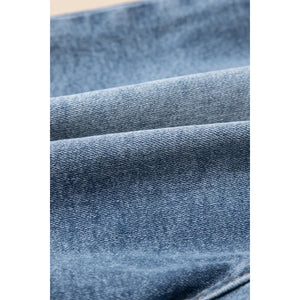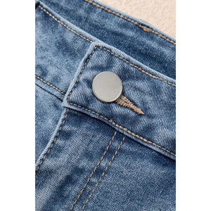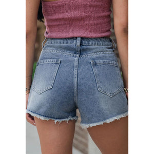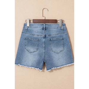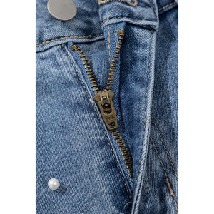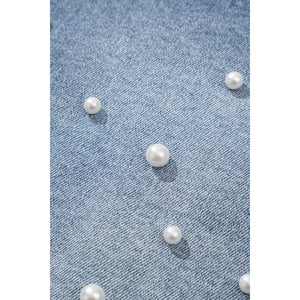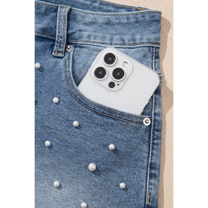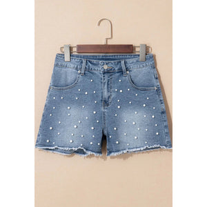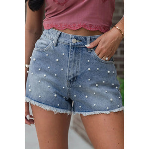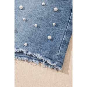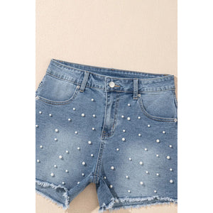 Pearl Beaded Raw Hem Wash Denim Shorts