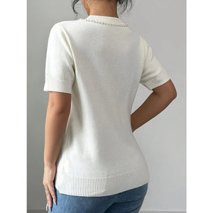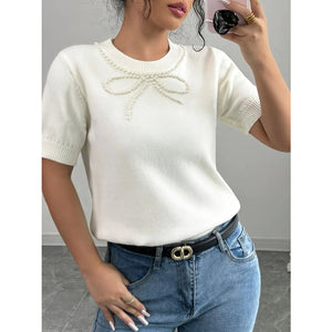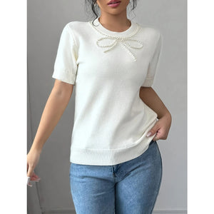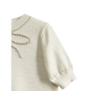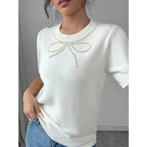 Pearl Bow Embellished Round Neck Sweater