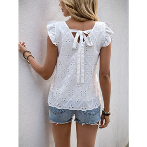 Perfee Eyelet V-Neck Ruffled Cap Sleeve Blouse