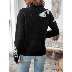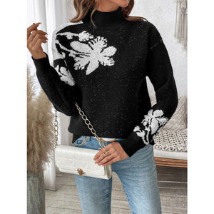 Perfee Flower Mock Neck Long Sleeve Sweater