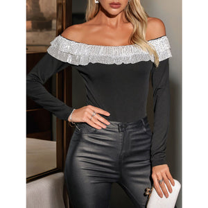 Perfee Sequin Ruffled Off-Shoulder Long Sleeve Bodysuit
