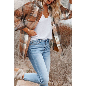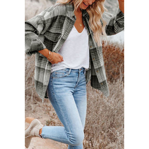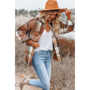 • An allover plaid print, front chest pockets, and tortoise buttons create a chic style