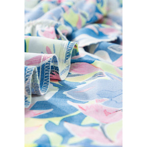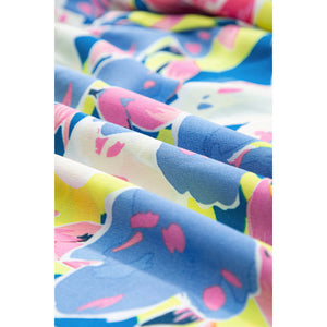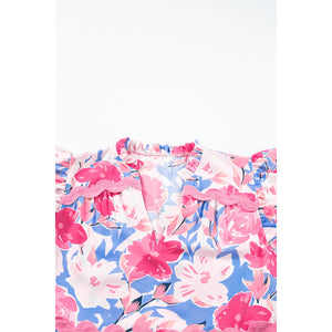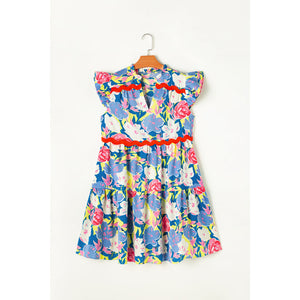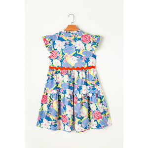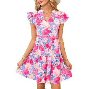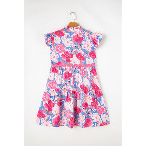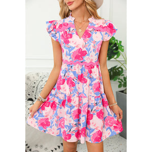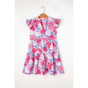 Pink Floral Printed V Notched Ric Rac Flutter Sleeve Dress