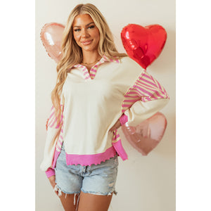 Pink Stripe Colorblock Patchwork Collared French Terry Knit Top