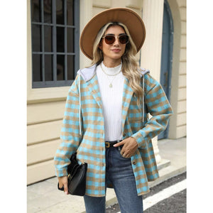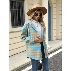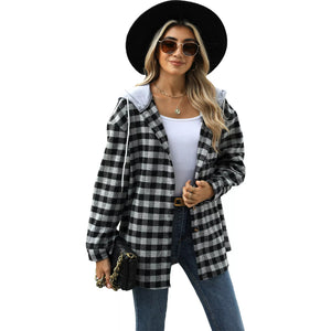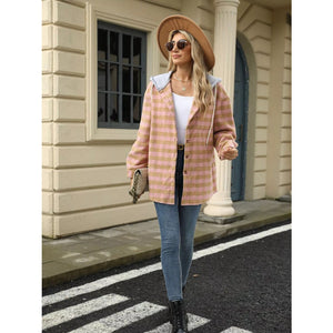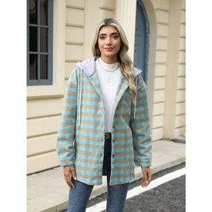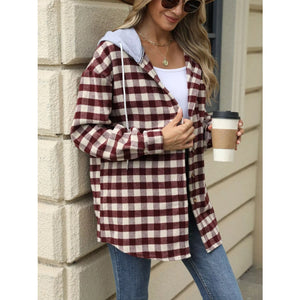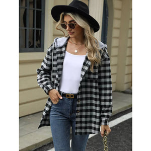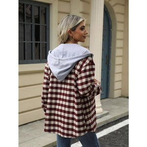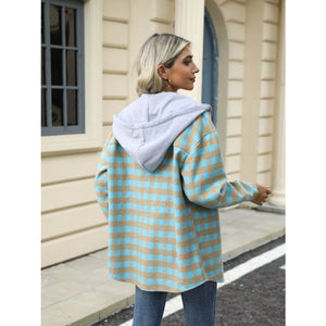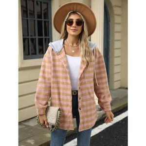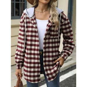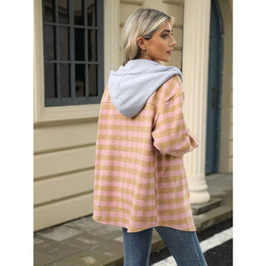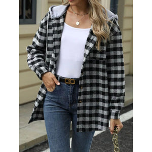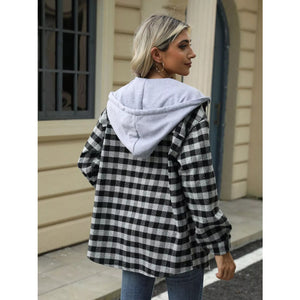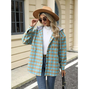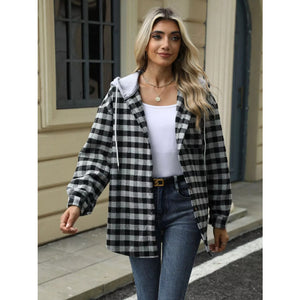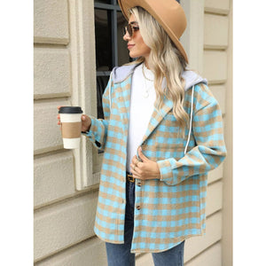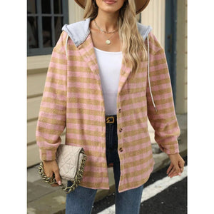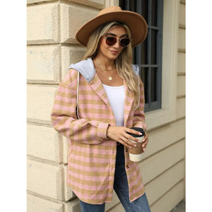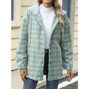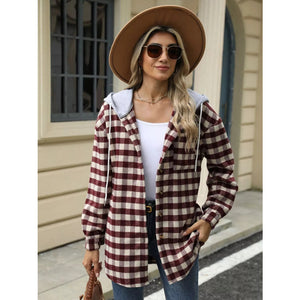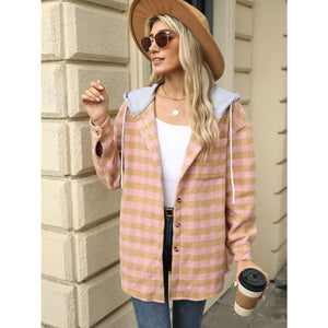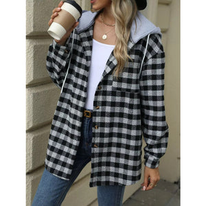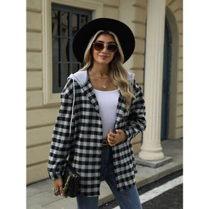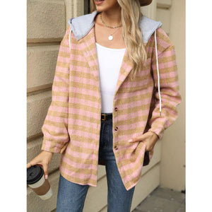 Plaid Button Up Long Sleeve Drawstring Hooded Jacket