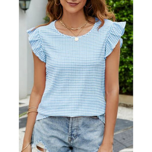 Plaid Ruffled Round Neck Cap Sleeve T-Shirt