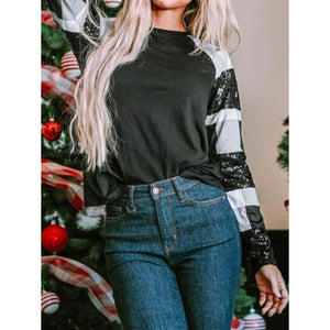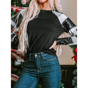 Plaid Sequin Long Sleeve Round Neck T-Shirt