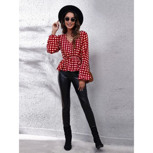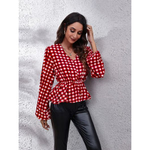 Plaid V-Neck Balloon Sleeve Peplum Blouse