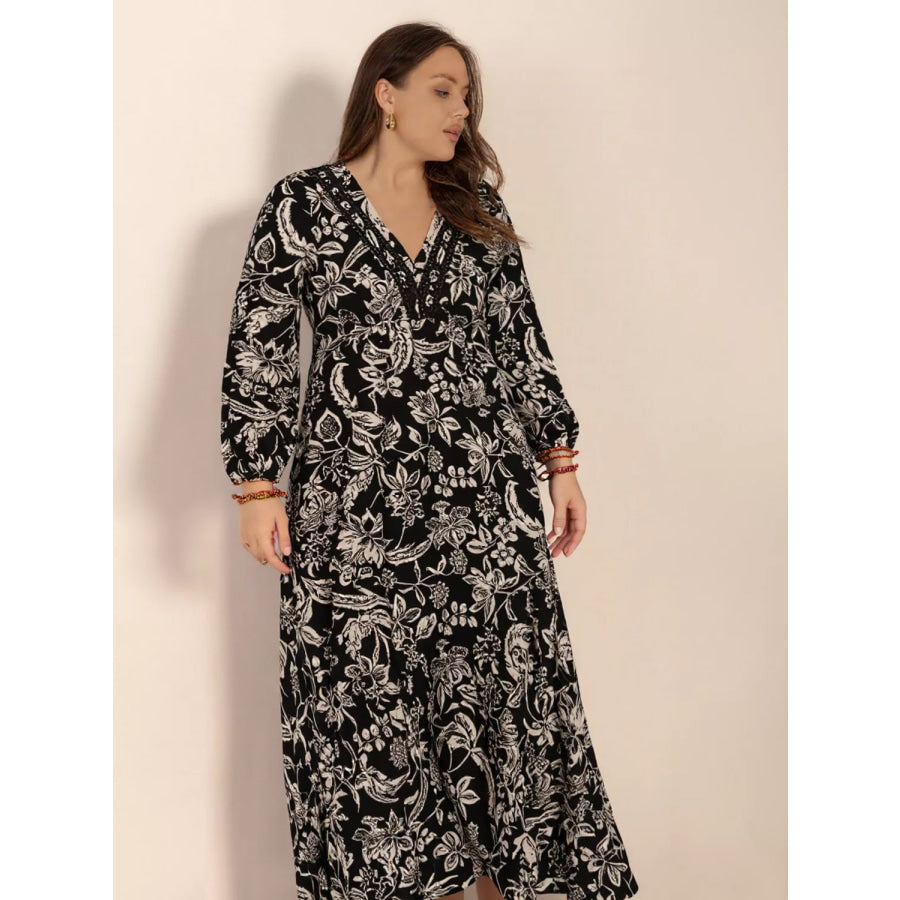 Plus Size Botanical Print Long Sleeve Midi Dress