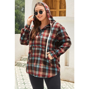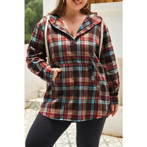 Plus Size Drawstring Plaid Quarter Button Hoodie