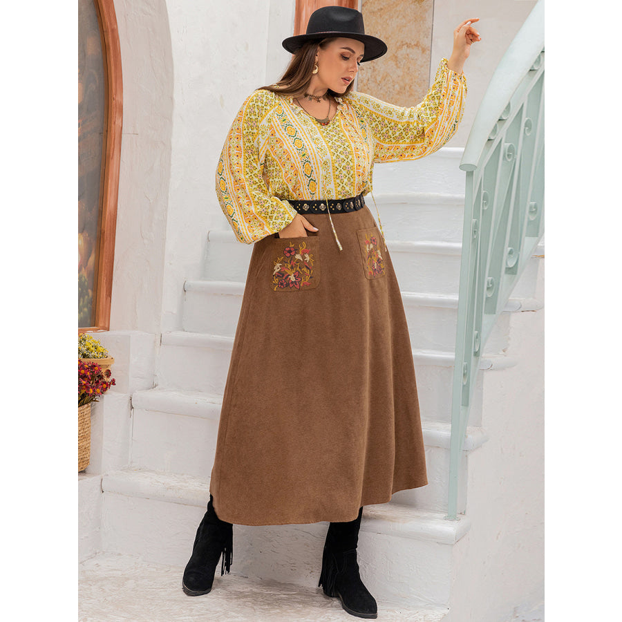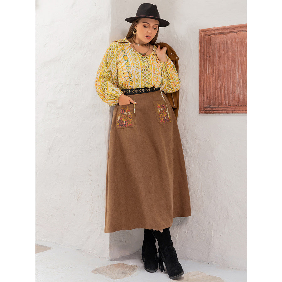 Plus Size Embroidered Pocketed High Waist Skirt