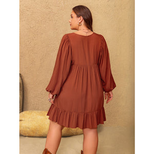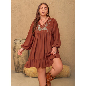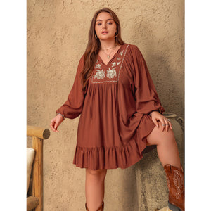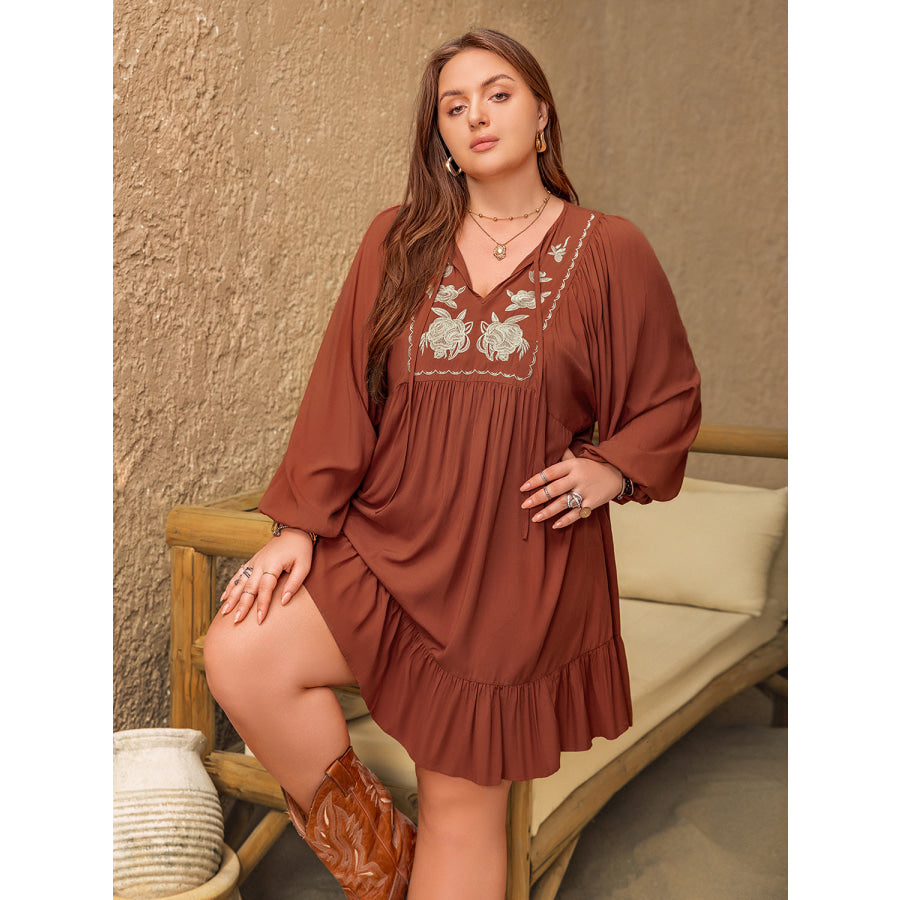 Plus Size Embroidered Tie Neck Balloon Sleeve Mini Dress