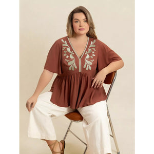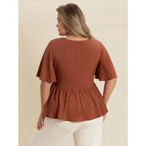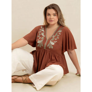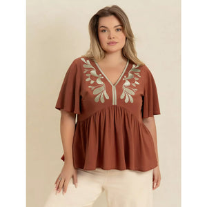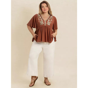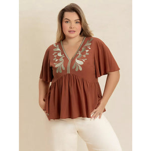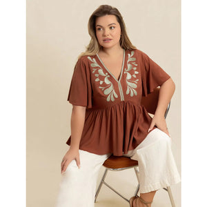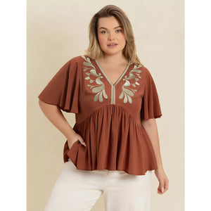 Plus Size Embroidered V-Neck Flutter Sleeve Blouse