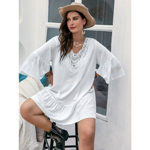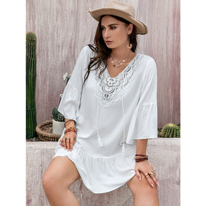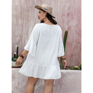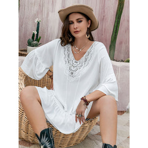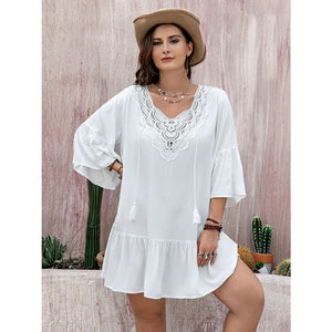 Plus Size Lace Detail Tie Neck Three-Quarter Sleeve Mini Dress