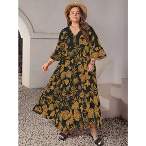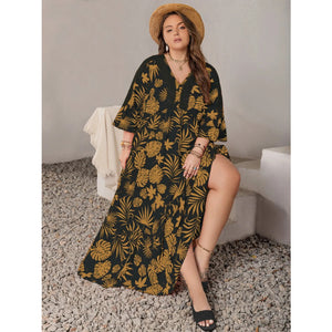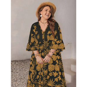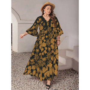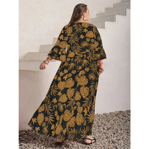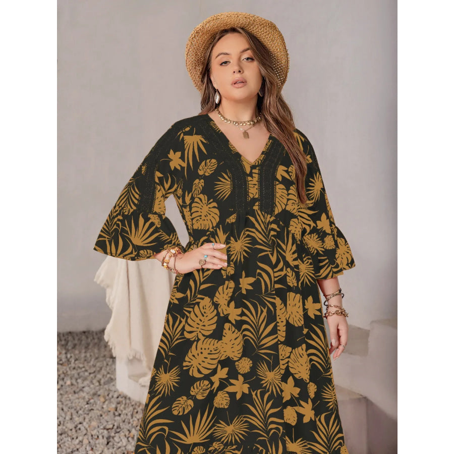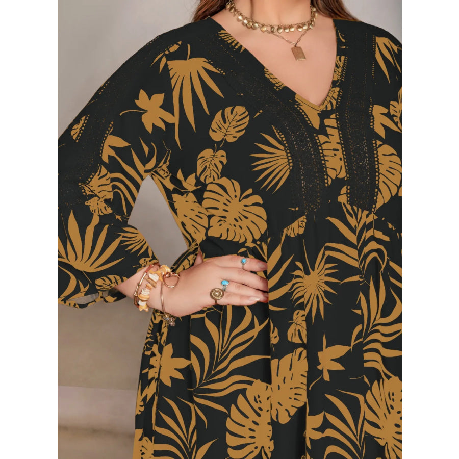 Plus Size Lace Detail Tropical Print Three-Quarter Sleeve Maxi Dress