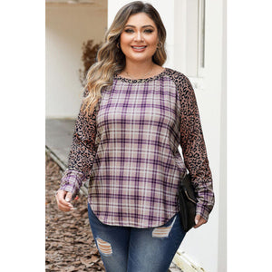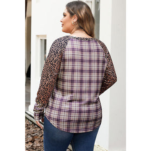 Plus Size Leopard Raglan Sleeve Plaid T-Shirt