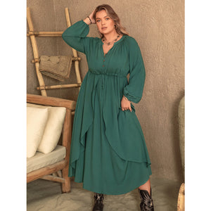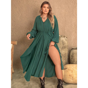 Plus Size Notched Layered Balloon Sleeve Midi Dress