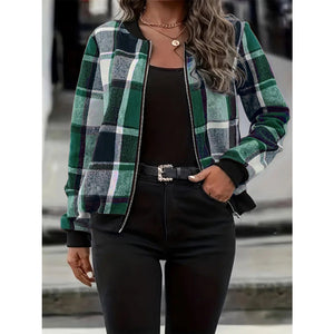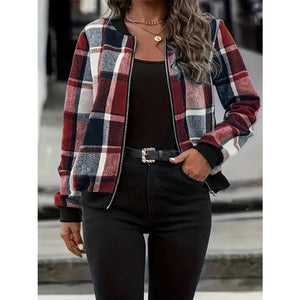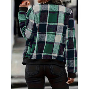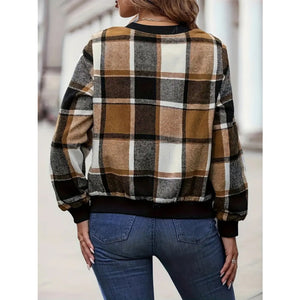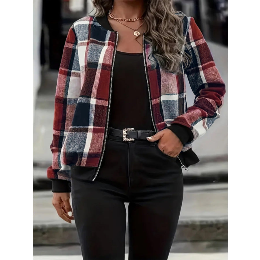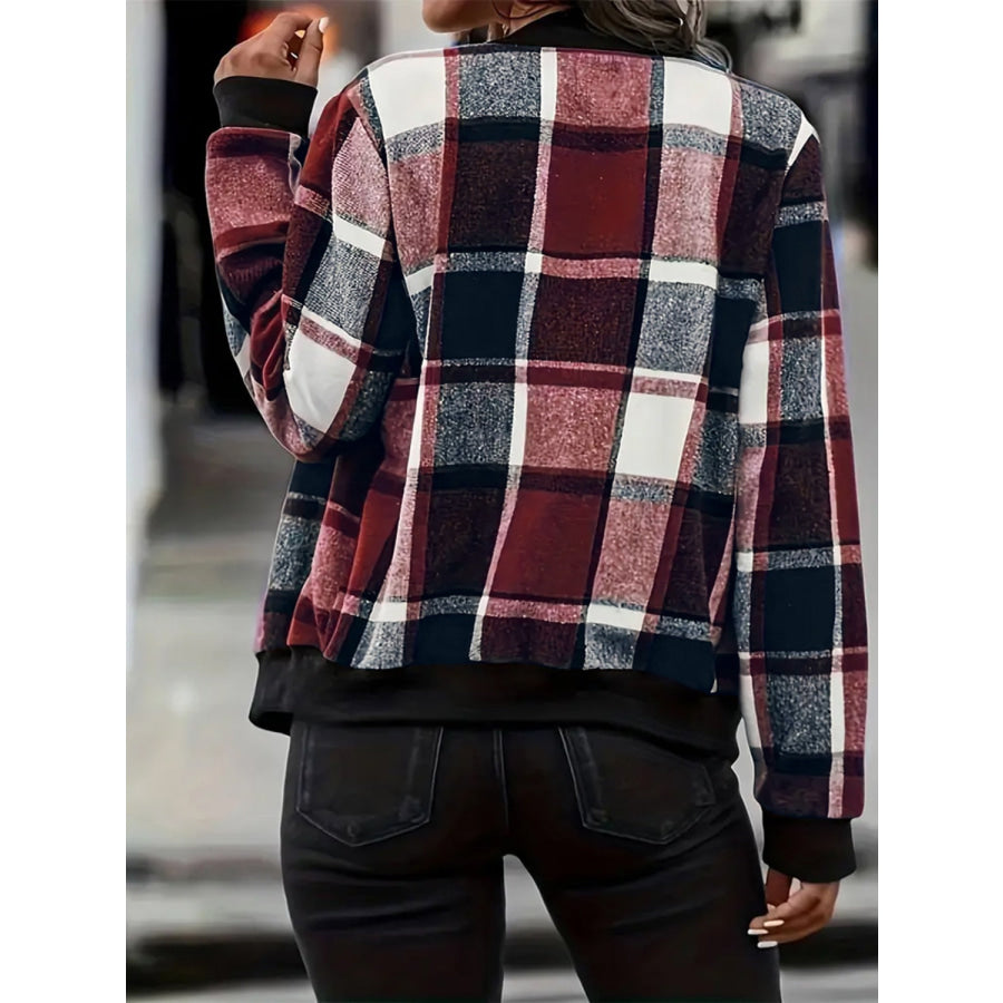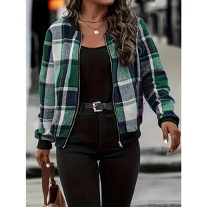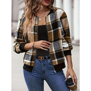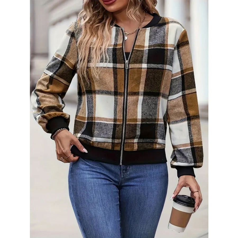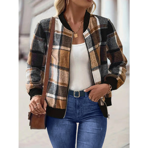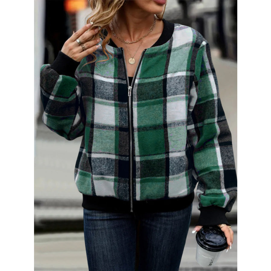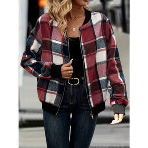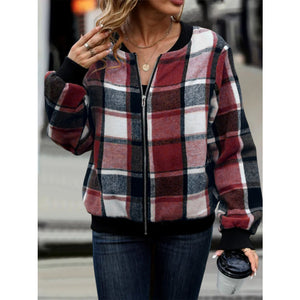 Plus Size Plaid Baseball Collar Zip Up Jacket