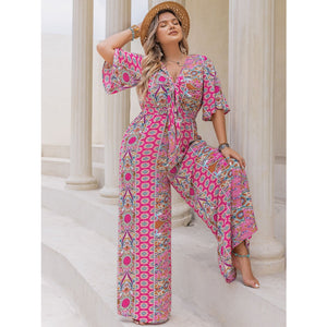 Plus Size Printed Half Sleeve Wide Leg Jumpsuit