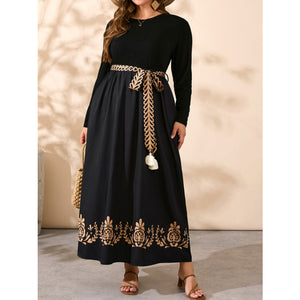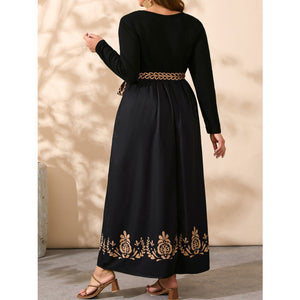 Plus Size Printed Hem Round Neck Long Sleeve Dress