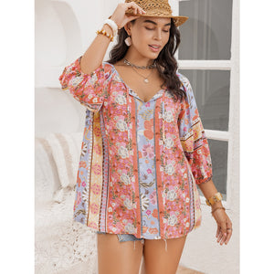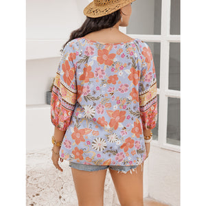 Plus Size Printed Tie Neck Balloon Sleeve Blouse