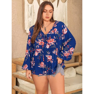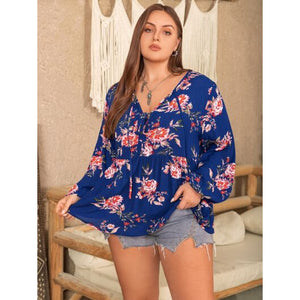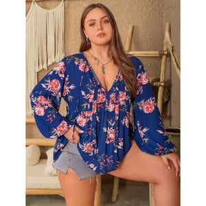 Plus Size Printed Tie Neck Balloon Sleeve Blouse