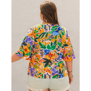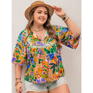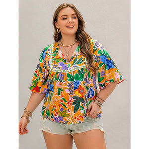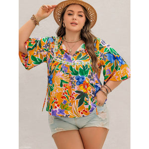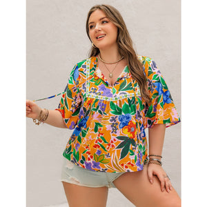 Plus Size Printed Tie Neck Half Sleeve Blouse