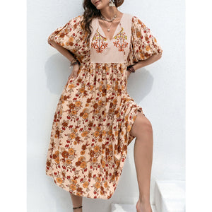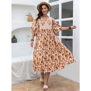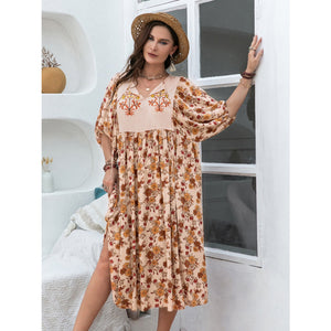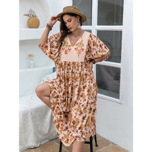 Plus Size Printed Tie Neck Half Sleeve Midi Dress